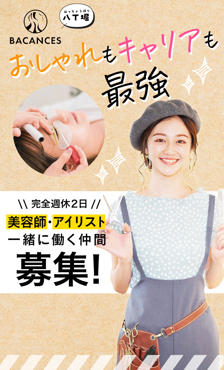 職種 美容師・アイリスト 雇用形態 正社員アルバイト業務委託 給与 美容師 正社員 スタイリスト 給料25万~+歩合給 ★指名歩合率30%〜40%★店販10% 正社員 アシスタント 給料22万〜 ★モデル手当30% アルバイト 時給1,200円〜1,500円 時給1,200円〜1,500円★店販10% 業務委託 売り上げ0〜120万まで指名50%フリー40%120〜180万指名60% フリー45%180万以上指名70% フリー50% アイリスト 正社員 月給25万円〜 ★技術売上30〜40% 業務委託 完全歩合 ★技術売上40%★技術売上60%(顧客数に応じて相談可能)★店販10% 勤務時間 10:00 – 22:00(所定勤務9時間/変形労働時間制)週4~5勤務希望シフト制(休日がシフト制) 休日 完全週休2日制★申請があれば土日休みも取得可能★ 福利厚生 社会保険完備家賃手当*正社員スタイリスト、アシスタント 休暇 年末年始休暇夏季休暇慶弔休暇リフレッシュ休暇 Instagram BACANCES 八丁堀 〒104-0032東京都中央区八丁堀2丁目15−1開成ビル1階